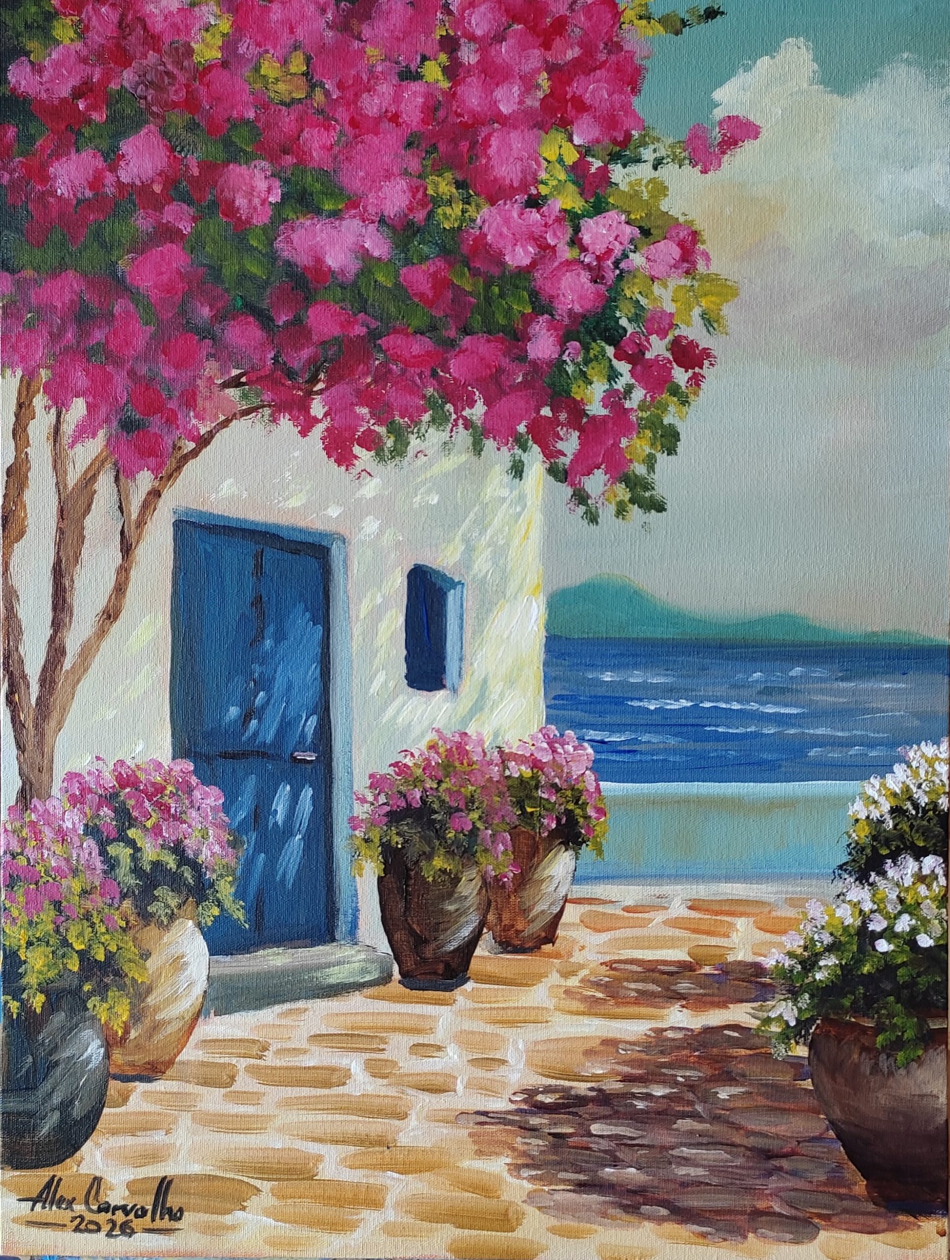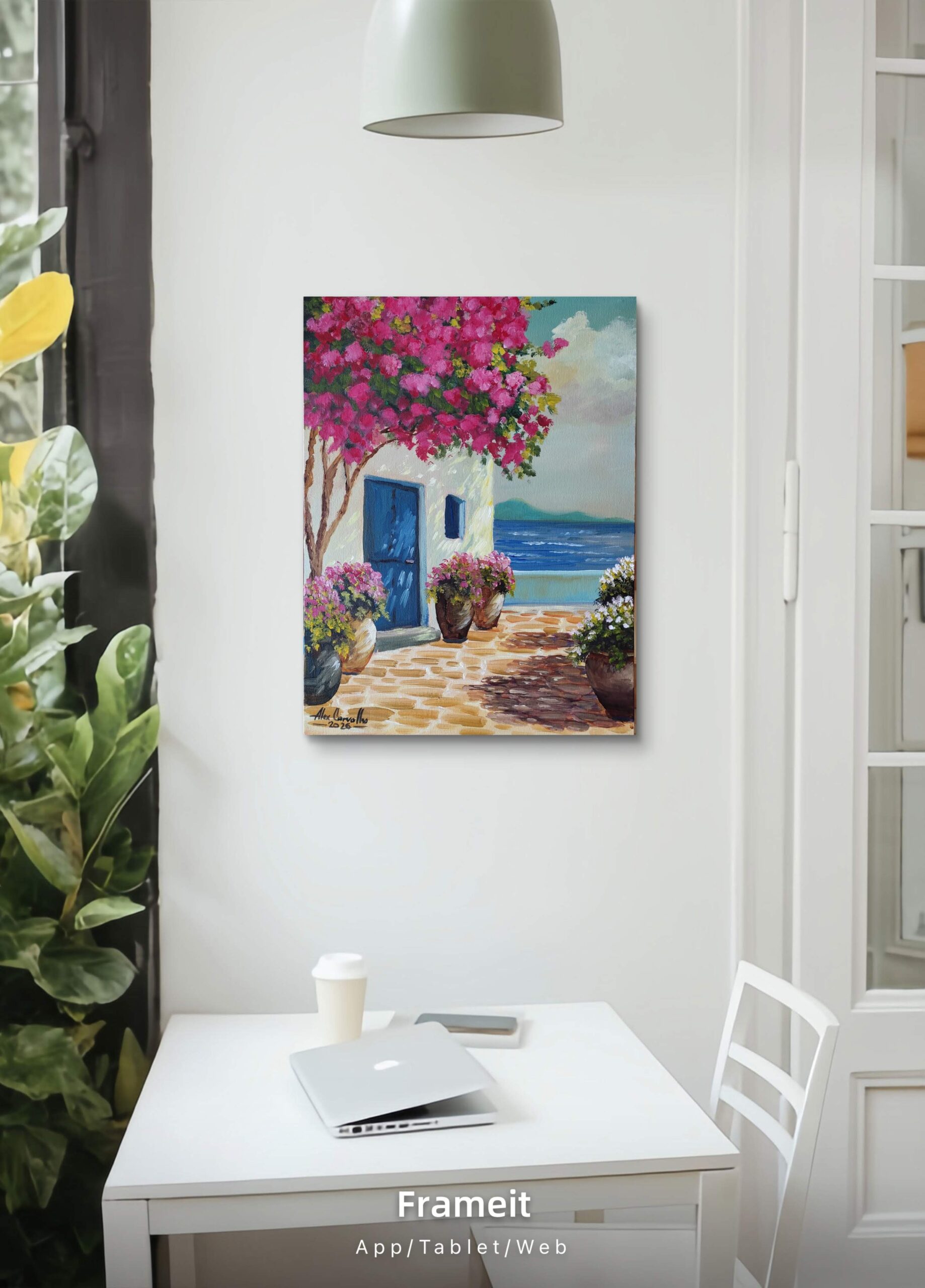 Sob a sombra colorida das flores, a casa se integra à paisagem costeira de Santorini, criando um ambiente íntimo e acolhedor.
