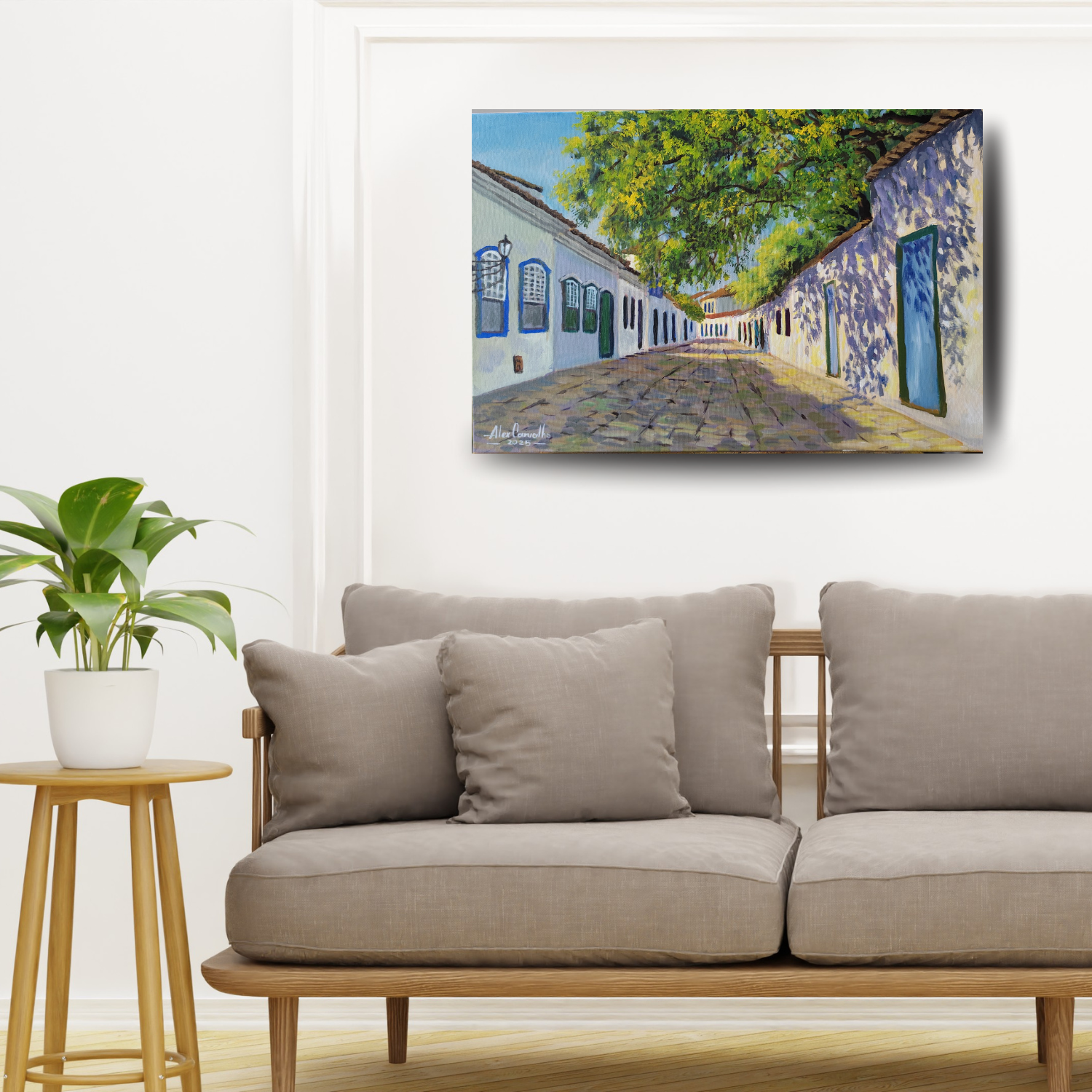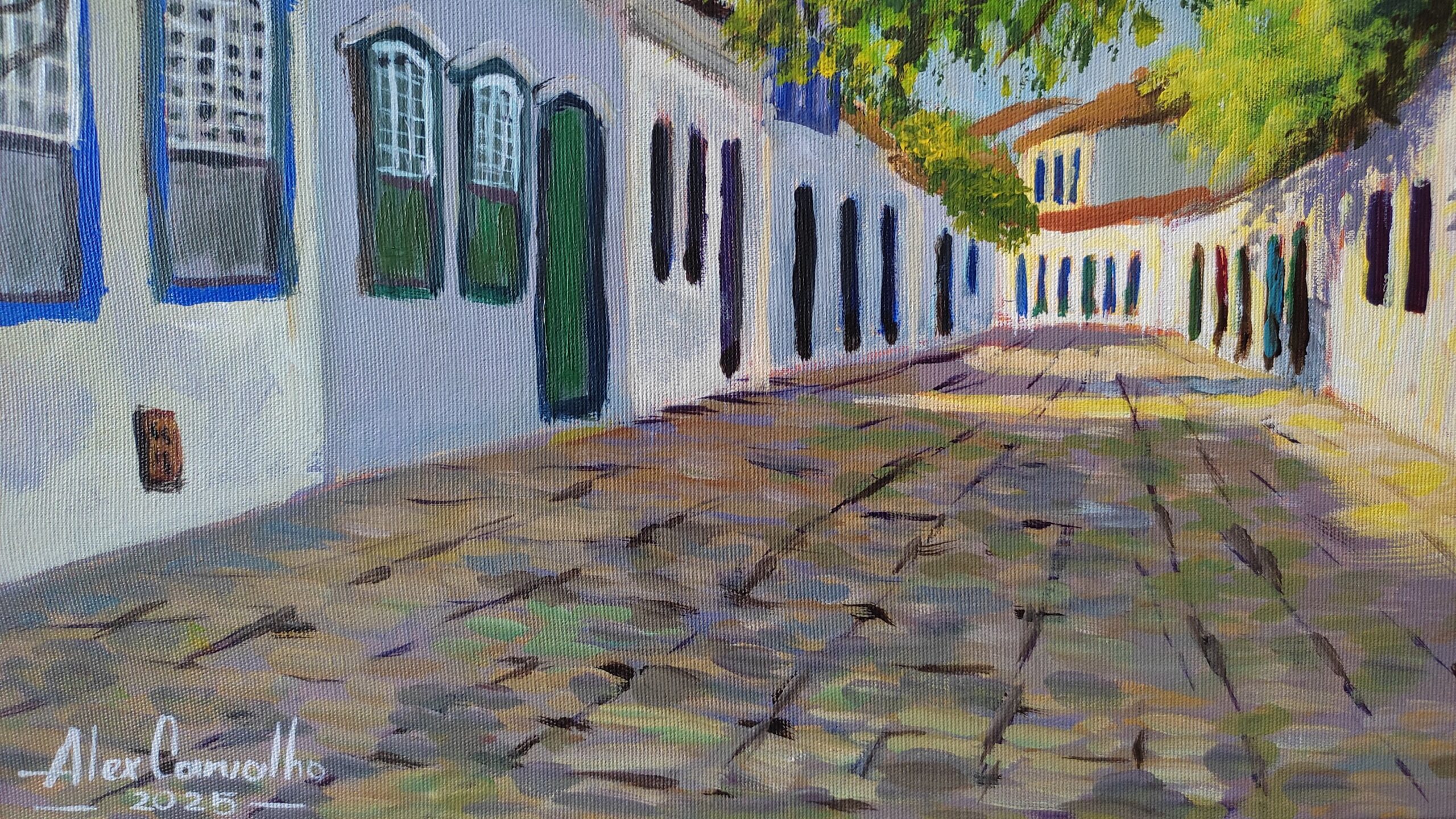 Nesta pintura, o artista Alex Carvalho captura a serenidade das ruas históricas de Paraty, onde a luz do sol atravessa a copa das árvores e desenha sombras orgânicas sobre as fachadas coloniais.